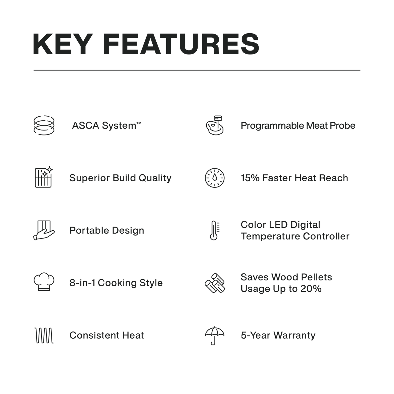 ASMOKE comes equipped with a side bucket to collect extra oil and grease for easy disposing.New ASCA SystemTM with auto clean ashes function.