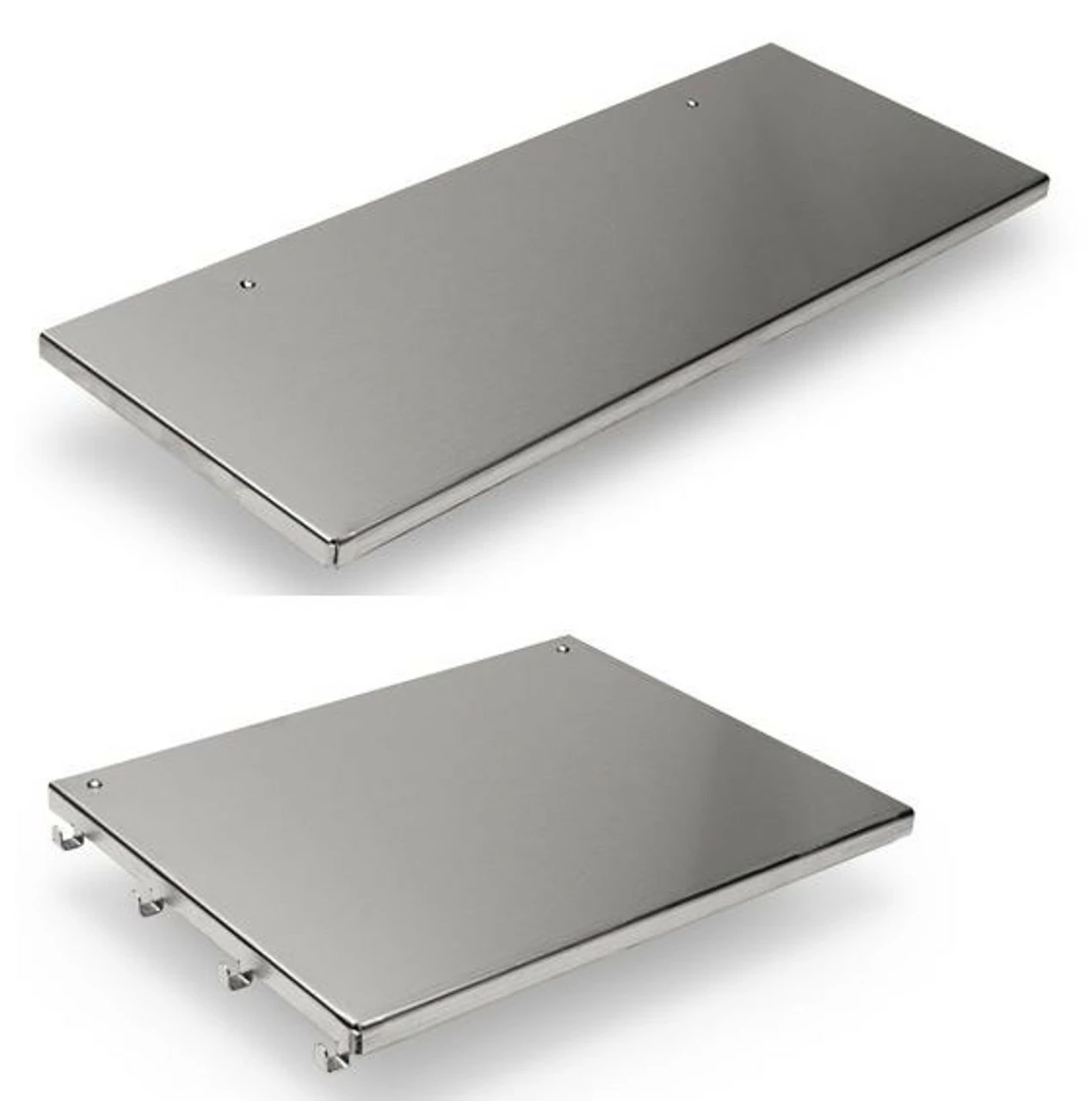 The sleeves simply slide over your existing wire shelves and a nut is tightened to hold them in place. The side shelf features three tool hooks to keep brushes and spatulas handy. Made of highly rust resistant stainless steel, the shelves wipe clean and create a solid surface to rest plates, thermometers, and condiments.